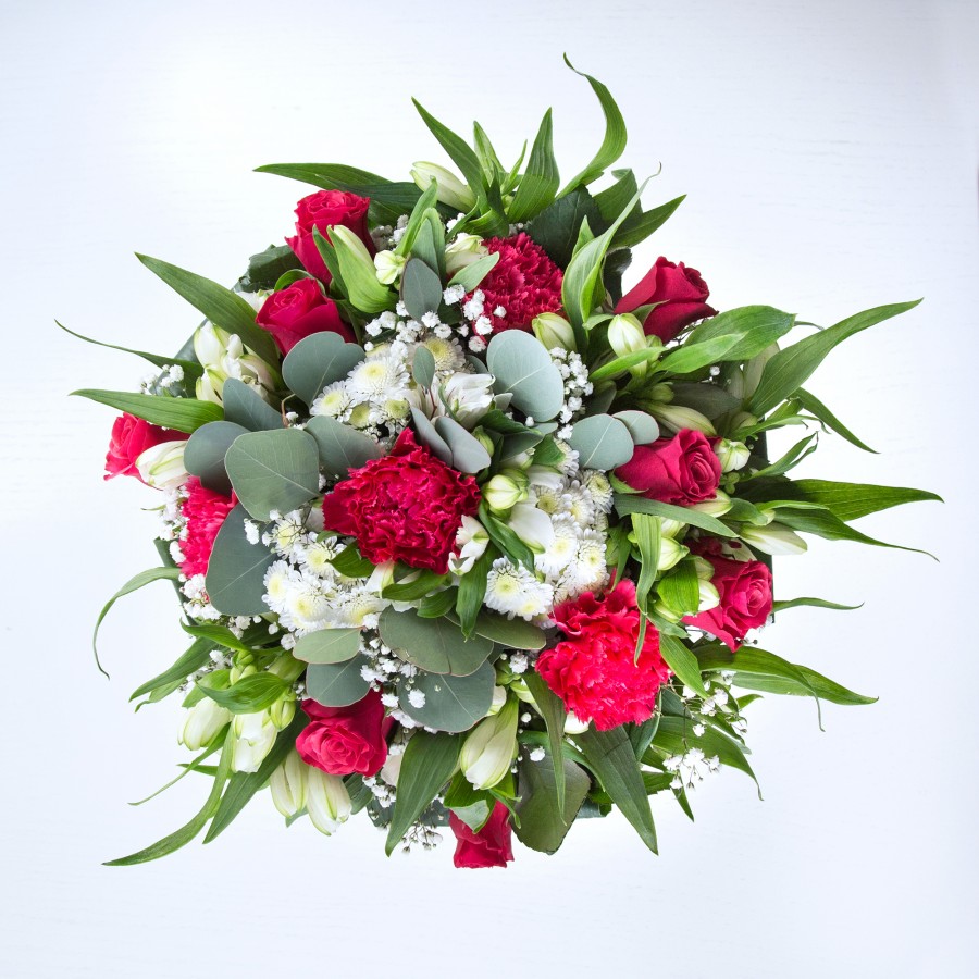 Celebrate special moments with our unique and vibrant bouquet. Featuring a stunning combination of red roses, white chrysanthemums, and elegant carnations, each flower is carefully chosen for its quality and freshness.