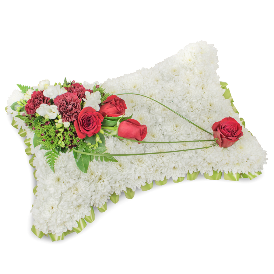 Convey your heartfelt condolences with our graceful bouquet, featuring white chrysanthemums, vibrant red roses, elegant white freesias, and dark red carnations, beautifully accented with dianthus and bear grass.